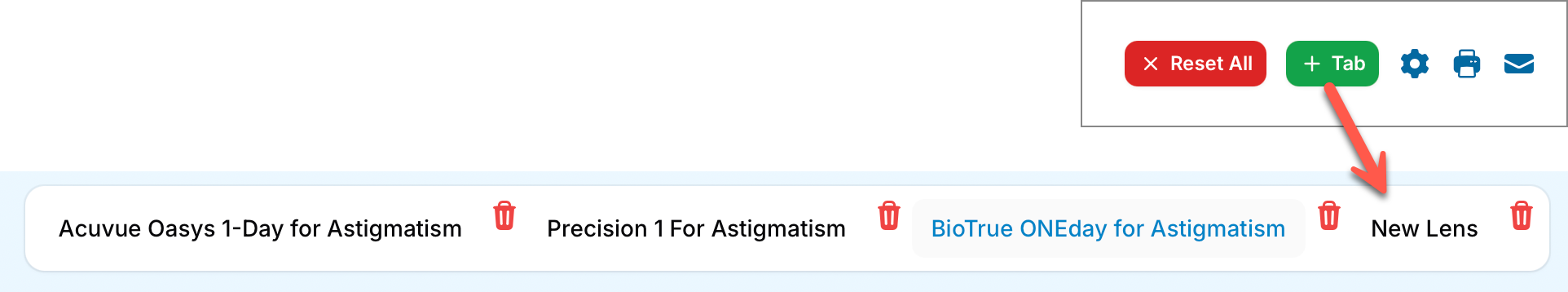 Each tab represents a different lens brand, allowing you to compare pricing and supply options.