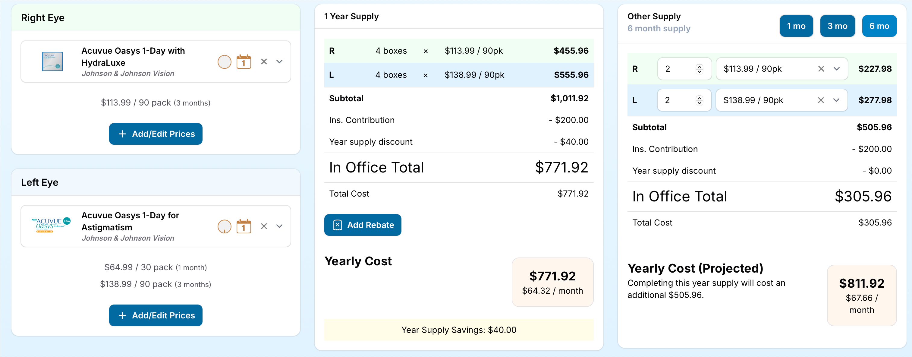 Yearly Cost (Projected): Calculates the cost of the selected partial supply PLUS the expense of additional lenses needed to complete a year supply.
